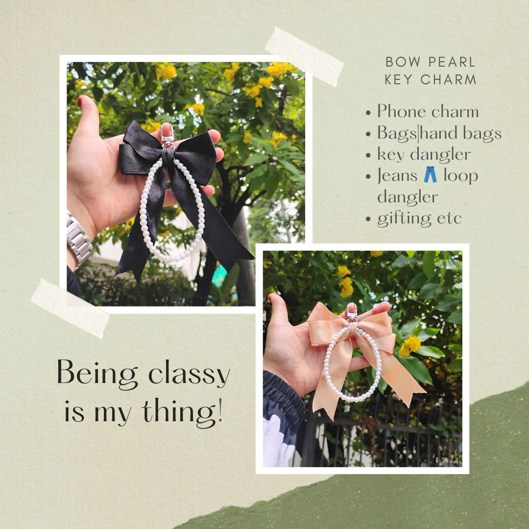 THIS PEARL BOW DANDLER IS CUTE AND FEMININE ACCESSORY FEATURING A SOFT SATIN PINK RIBBON TIED INTO A PERFECT BOW, WITH STRANDS OF FAUX PEARLS ENDING IN DELICATE BEADD. ITS ATTACHED TO A KEY RING CLIP, MAKING IT VERSATILE AND EASY TO STYLE .